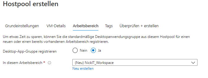 Hier muss ein Arbeitsbereich angegeben bzw. neu erstellt werden und es kann angegeben werden, ob gleich eine Anwendungsgruppe (Name: Hostpool_01-DAG) mit dem veröffentlichten Desktop des Hostpools erzeugt werden soll.
