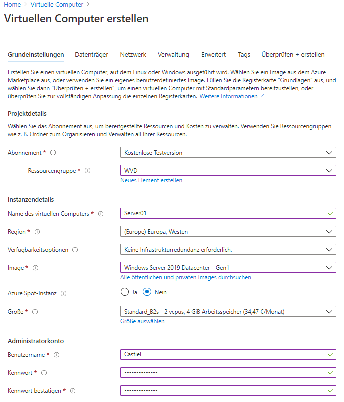 Um Gruppenrichtlinien in der Azure Domäne erstellen zu können, wird nun ein virtueller Server erstellt.