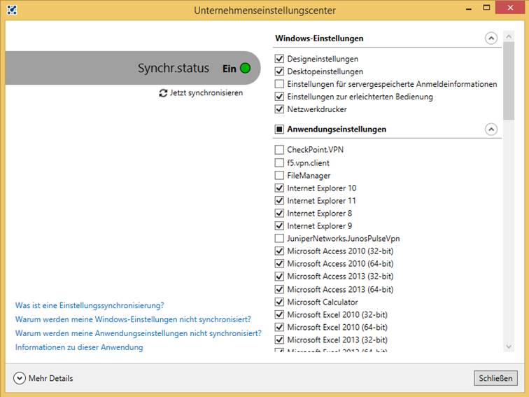 Bis UE-V 2.1 SP1 konnte der Anwender über das Unternehmenseinstellungscenter selber wählen, welche Einstellungen gespeichert werden sollten. Mit UE-V für Windows 10, Version 1607 gibt es das Center nicht mehr.